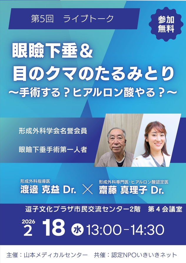 2月ライブトークは、現在、山本メディカルに所属している手術担当渡邊医師を交え、「目」をテーマにしたライブトークを行います。真理子理事長も登壇します。